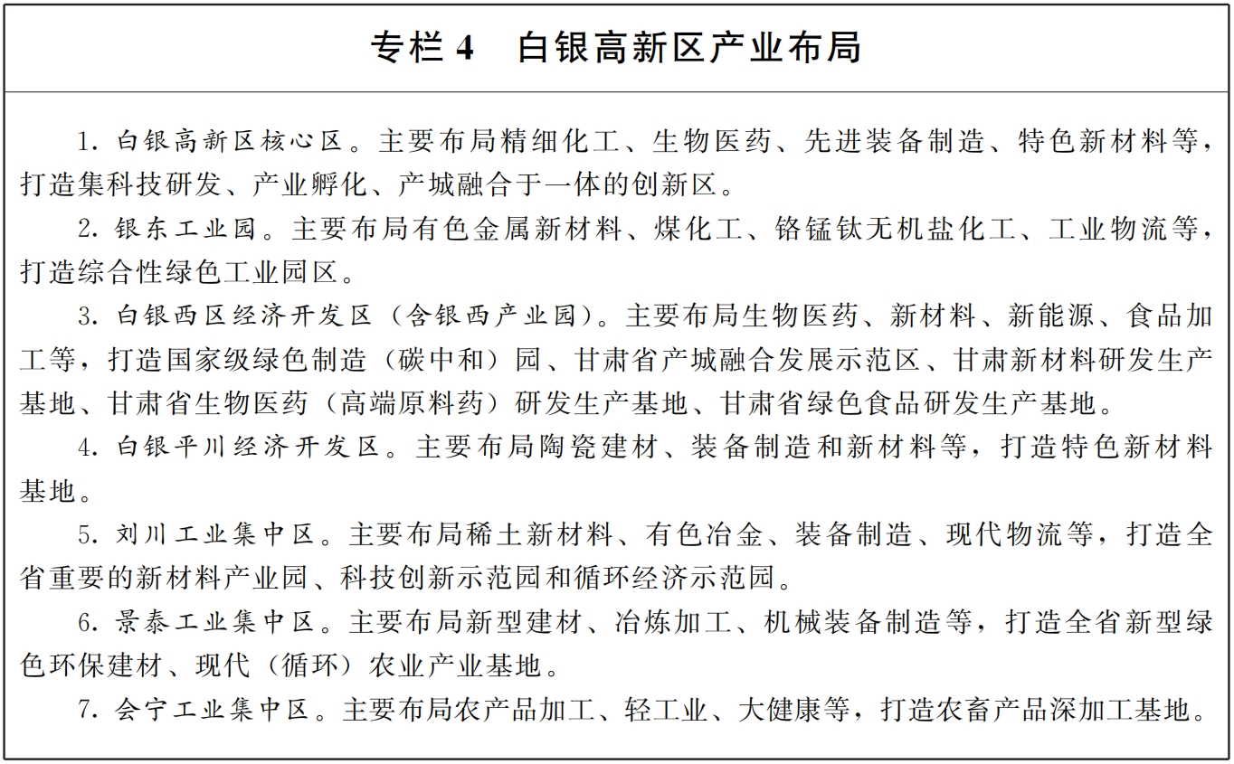 白银高新区。包含白银高新区核心区、银东工业园、白银西区经济开发区(含银西产业园)、白银平川经济开发区、刘川工业集中区、景泰工业集中区、会宁工业集中区等七个园区,重点发展绿色化工、先进装备制造、生物医药、绿色冶金、新材料、新能源、新型建材、特色农业、现代服务业等。