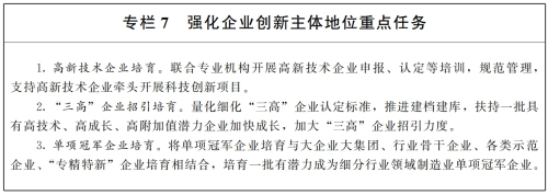 1.培育壮大科技创新型企业。完善企业孵化、培育、引进和支持机制,健全科技型企业孵化平台体系,构建“科技型中小企业—省级科技创新型企业—高新技术企业—科技领军企业”的梯次培育发展体系,实施省级科技创新型企业和高新技术企业倍增计划,培育或招引一批科技型中小企业、“三高”(高技术、高成长、高附加值)企业、“专精特新”企业、制造业单项冠军企业。支持区内有条件的高新技术企业在科创板、北交所、新三板等境内外资本市场上市、挂牌和融资。鼓励引导区内大企业开放创新资源和应用场景,推动大中小企业融通发展。