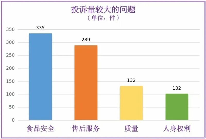 从投诉问题来看,投诉受理量较大的主要有:食品安全(335件)、售后服务(289件)、质量(132件)、人身权利(102件)。