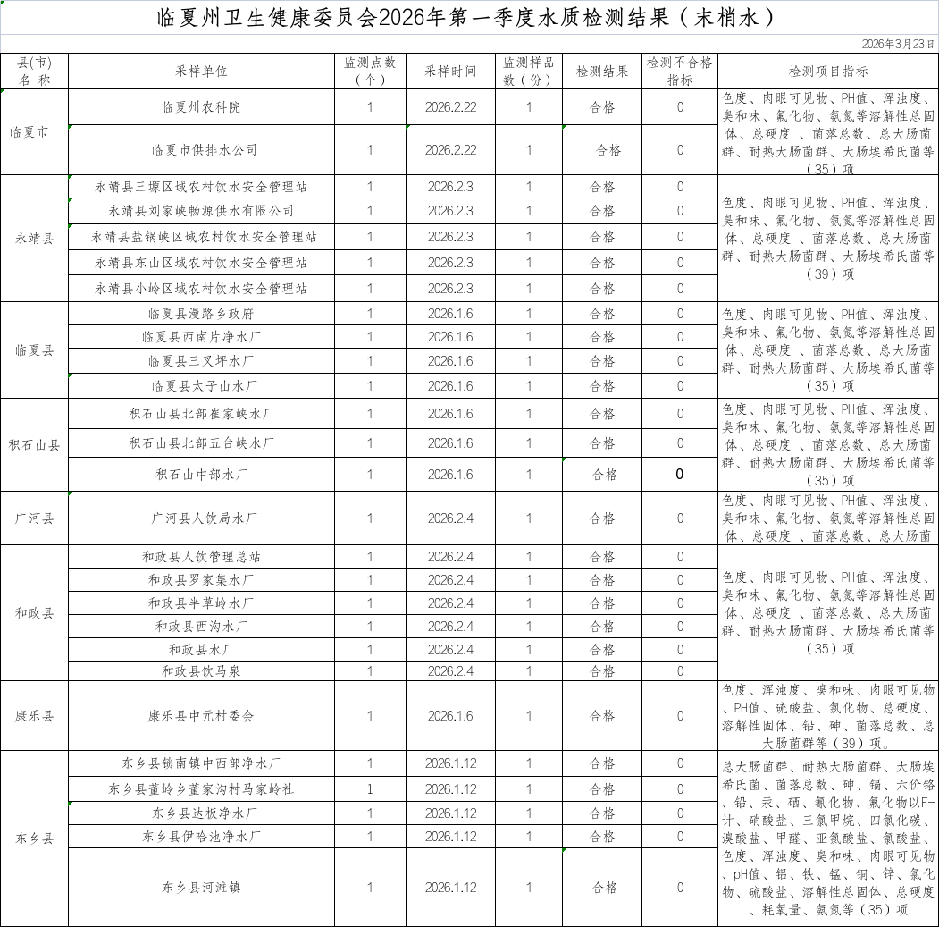 临夏州卫生健康委员会2026年第一季度水质检测结果(末梢水)