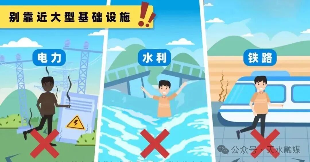 别靠近大型基础设施。强震可能会对电力、水利、铁路等大型基础设施造成影响,诱发次生灾害,一定要提前远离。