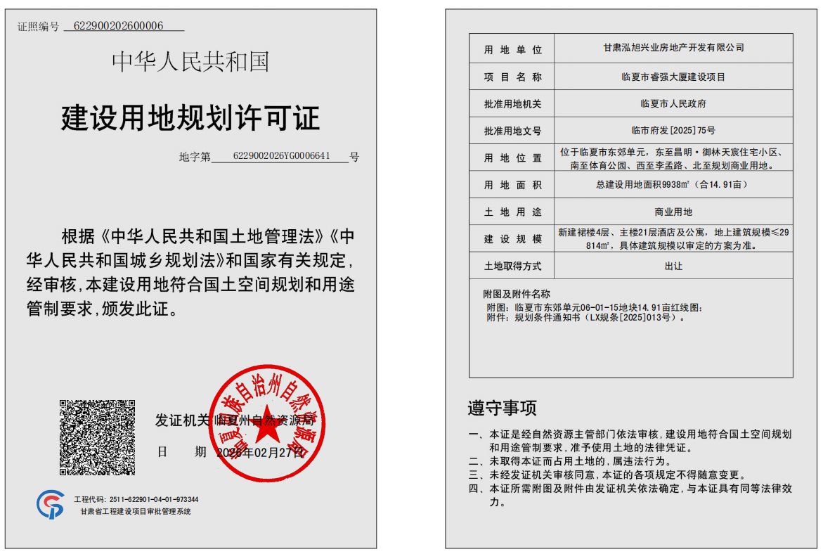 甘肃泓旭兴业房地产开发有限公司向我局申请办理临夏市睿强大厦建设项目建设用地规划许可证,我局按程序对申报材料进行了审核并做出予以办理的决定,现依据《中华人民共和国行政许可法》《中华人民共和国城乡规划法》《自然资源领域基层政务公开标准指引》等相关法律规定,对许可证证载内容进行公布: