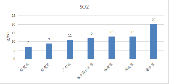 (6)和政县PM10浓度均值为81ug/m3,与去年同期下降9.0%;PM2.5浓度均值为36ug/m3,与去年同期下降32.1%;SO2浓度均值为13ug/m3,与去年同期相比下降23.5%;NO2浓度均值为26ug/m3,与去年同期上升18.2%;CO浓度均值为1.5mg/m3,与去年同期下降6.2%;O3浓度均值为111ug/m3,与去年同期下降7.5%;优良率平均为87.1%,与去年同期下降9.5%。