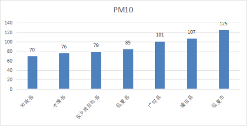 各县市PM10均超过国家年二级标准(60微克/立方米)。