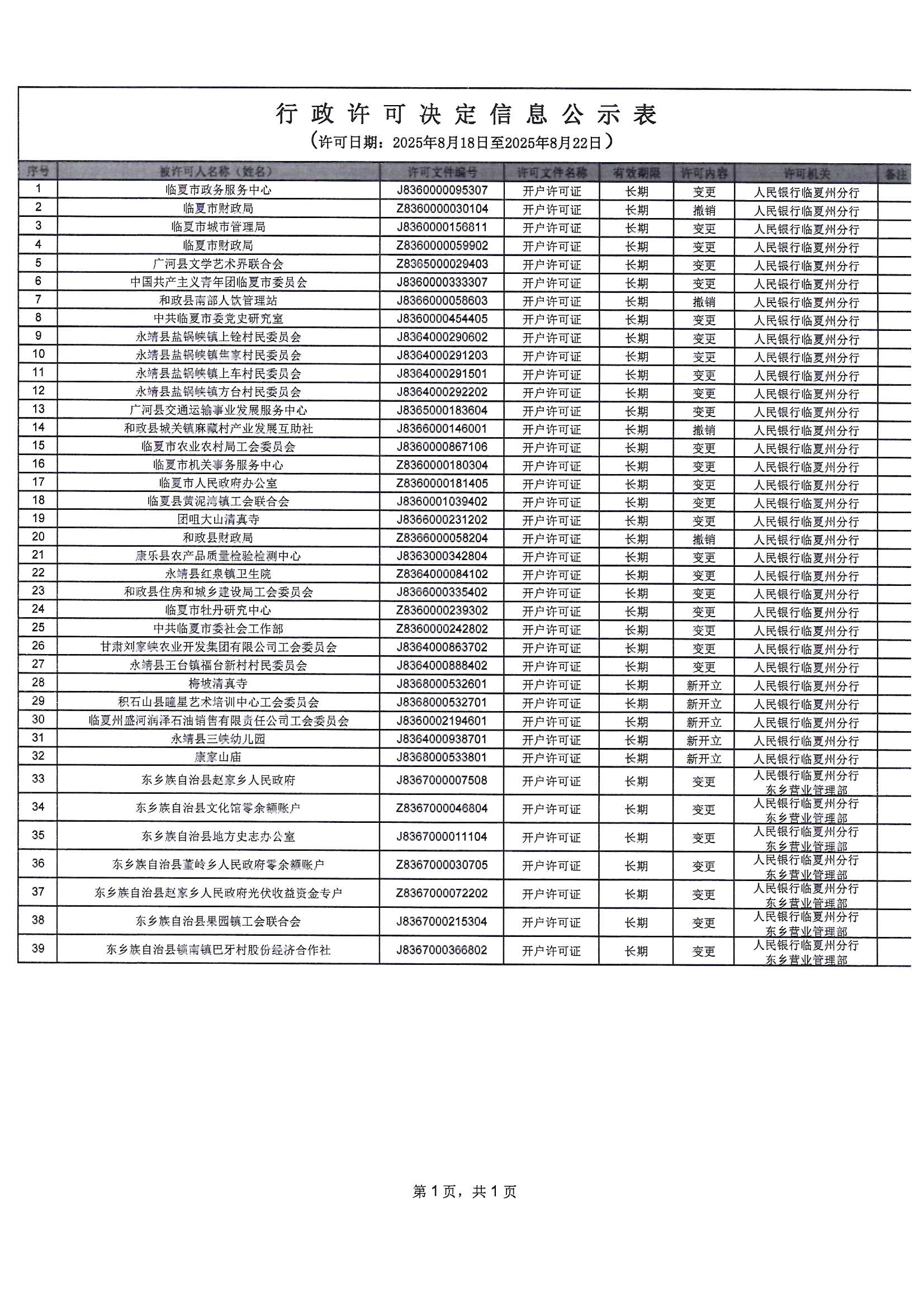 人民银行临夏州分行行政许可信息公示表(2025年8月18日-2025年8月22日)