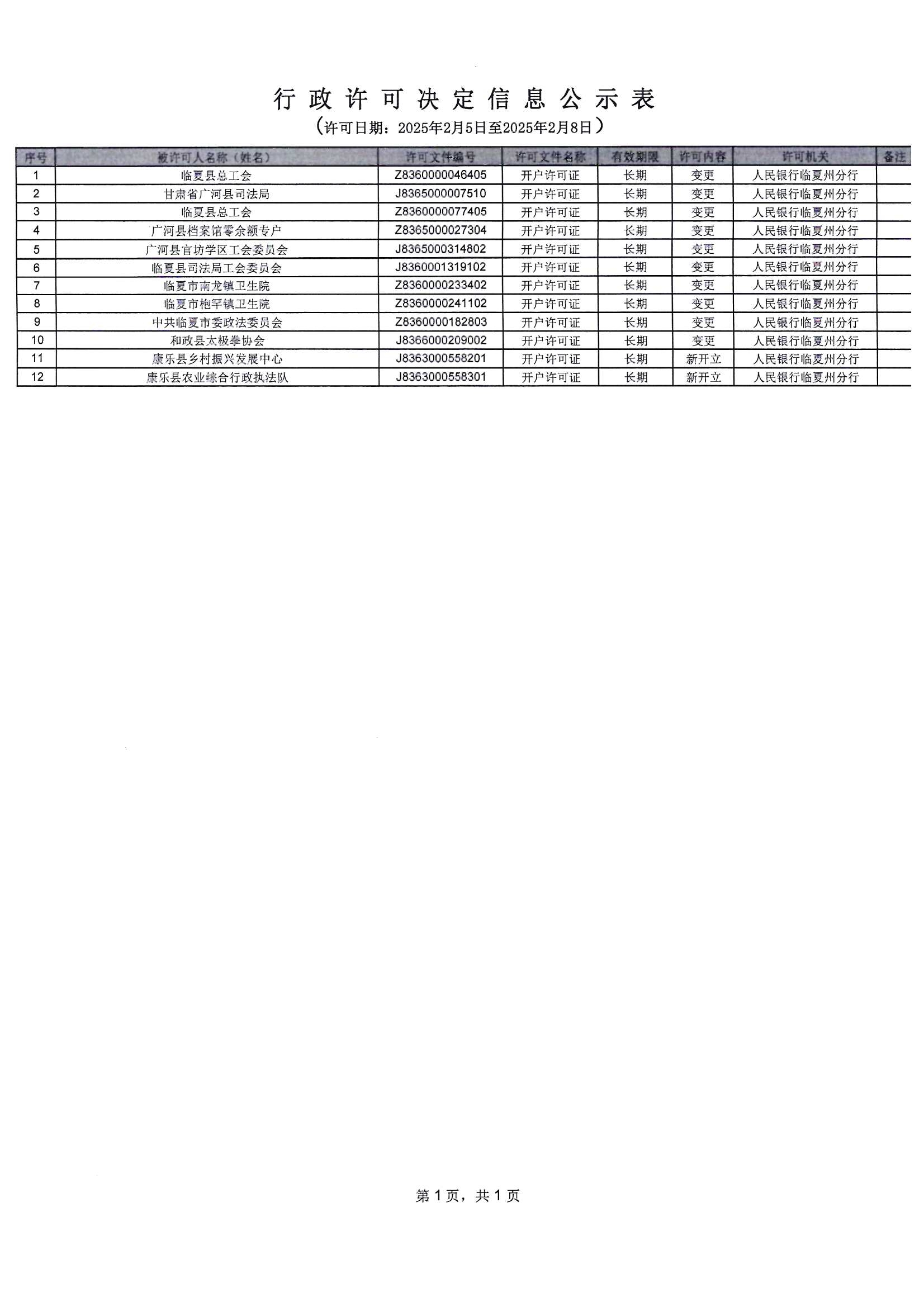 中国人民银行临夏州分行银行账户业务许可决定信息公示表(2025年2月5日-2025年2月8日)