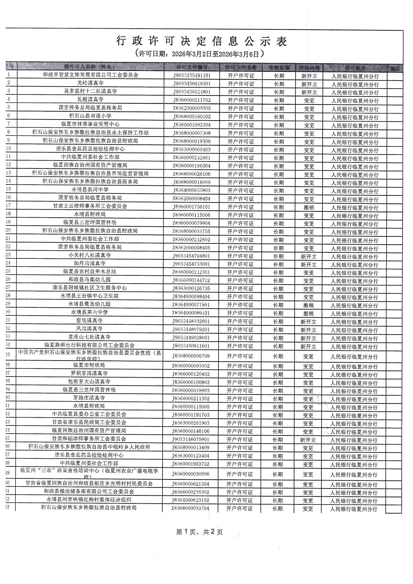 人民银行临夏州分行行政许可信息公示表(2026年3月2日-2026年3月6日)