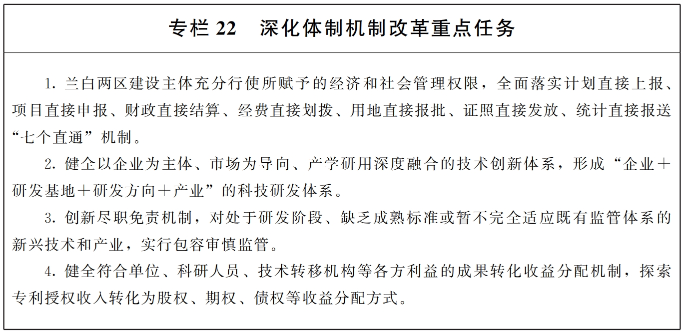 坚持科技创新和制度创新“双轮驱动”,谋划出台相关配套政策措施,强化重大改革举措联动,统筹规范管理,优化资源配置,提升服务保障,鼓励先行先试,率先从体制机制上实现突破,加快推进兰白两区治理体系和治理能力现代化。