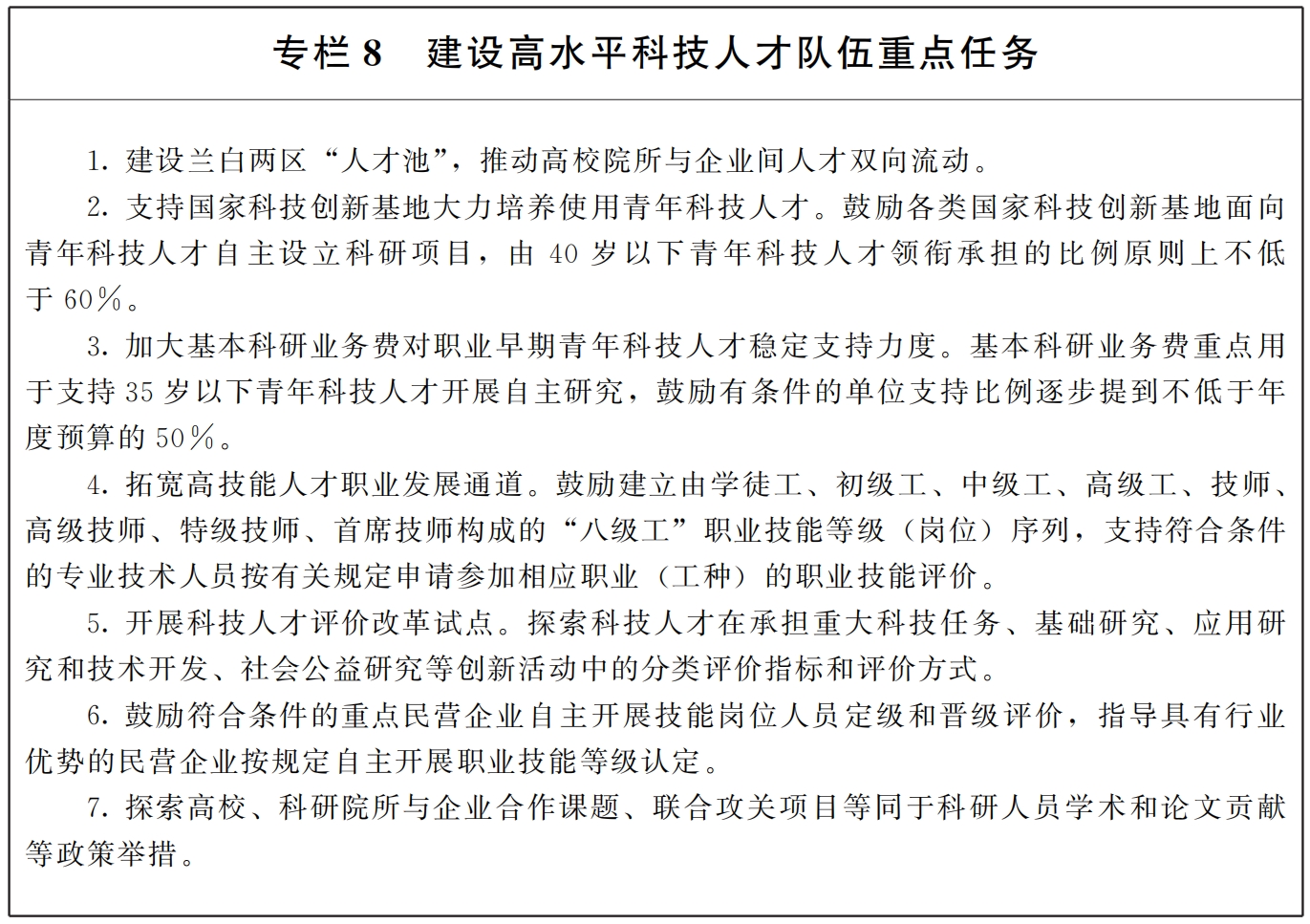 1.稳定支持高层次科技人才。实施更加精准的高层次科技人才支持政策,鼓励开展基于信任的首席科学家负责制,定向支持高层次人才和创新团队在兰白两区开展应用基础研究和产业化技术攻关。建立具有战略科学家潜质的复合型人才选拔和培养机制,构建梯次衔接的战略科技人才、科技领军人才和创新团队、优秀青年科技人才等全链条人才成长机制。支持园区依托国家和省级科技人才计划项目,培养一批具有全球思维、战略眼光、市场开拓精神和社会责任感的优秀企业家。大力集聚连续创业者、企业高管、职业经理人等,带动形成一批优秀创新创业团队。引导国家级专家服务基地、科技领军人才创新驱动中心等高端人才服务基地为兰白两区提供更多智力服务。