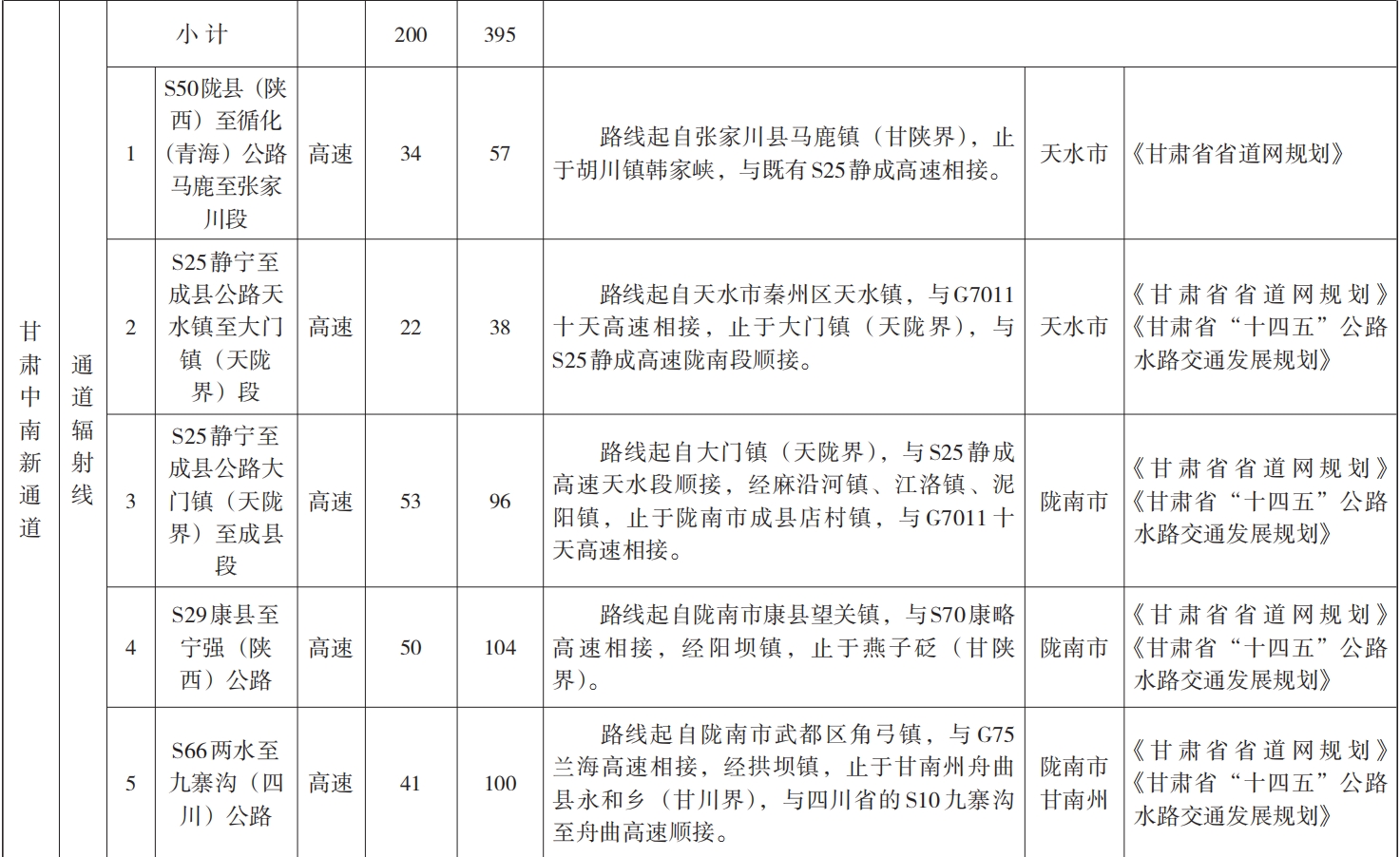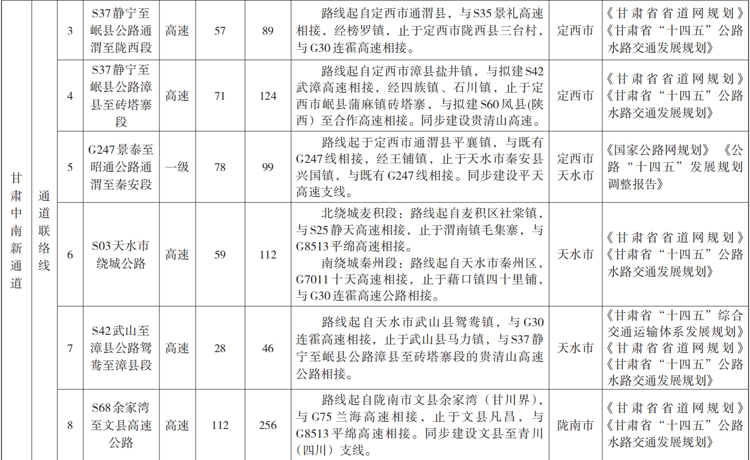 (二)甘肃中南高速公路新通道。该通道起于白银市景泰县、与G1816乌玛高速相接,止于陇南市礼县、与G7011十天高速相接,自北向南贯穿白银、定西、天水、陇南4市,辐射景泰、靖远、平川、会宁、安定、通渭、陇西、漳县、秦州、武山、甘谷、秦安、张家川、礼县、成县、徽县、康县、武都、文县19县(区)。该通道由1条主通道、8条通道联络线和5条通道辐射线构成。主通道全长约447公里(利用在建54公里、新建393公里),新建S35景泰至礼县高速景泰至马坞段,与在建S35陇南段相接形成主通道。带动建设S43定西至渭源、S37静宁至通渭、S37通渭至陇西、S37漳县至砖塔寨、G247通渭至秦安、S03天水绕城、S42武山至漳县、S68余家湾至文县(含文县至青川公路)等联络线和S50马鹿至张家川、S25天水镇至大门镇(天陇界)、S25大门镇(天陇界)至成县、S29康县至宁强(陕西)、S66两水至九寨沟(四川)等辐射线。