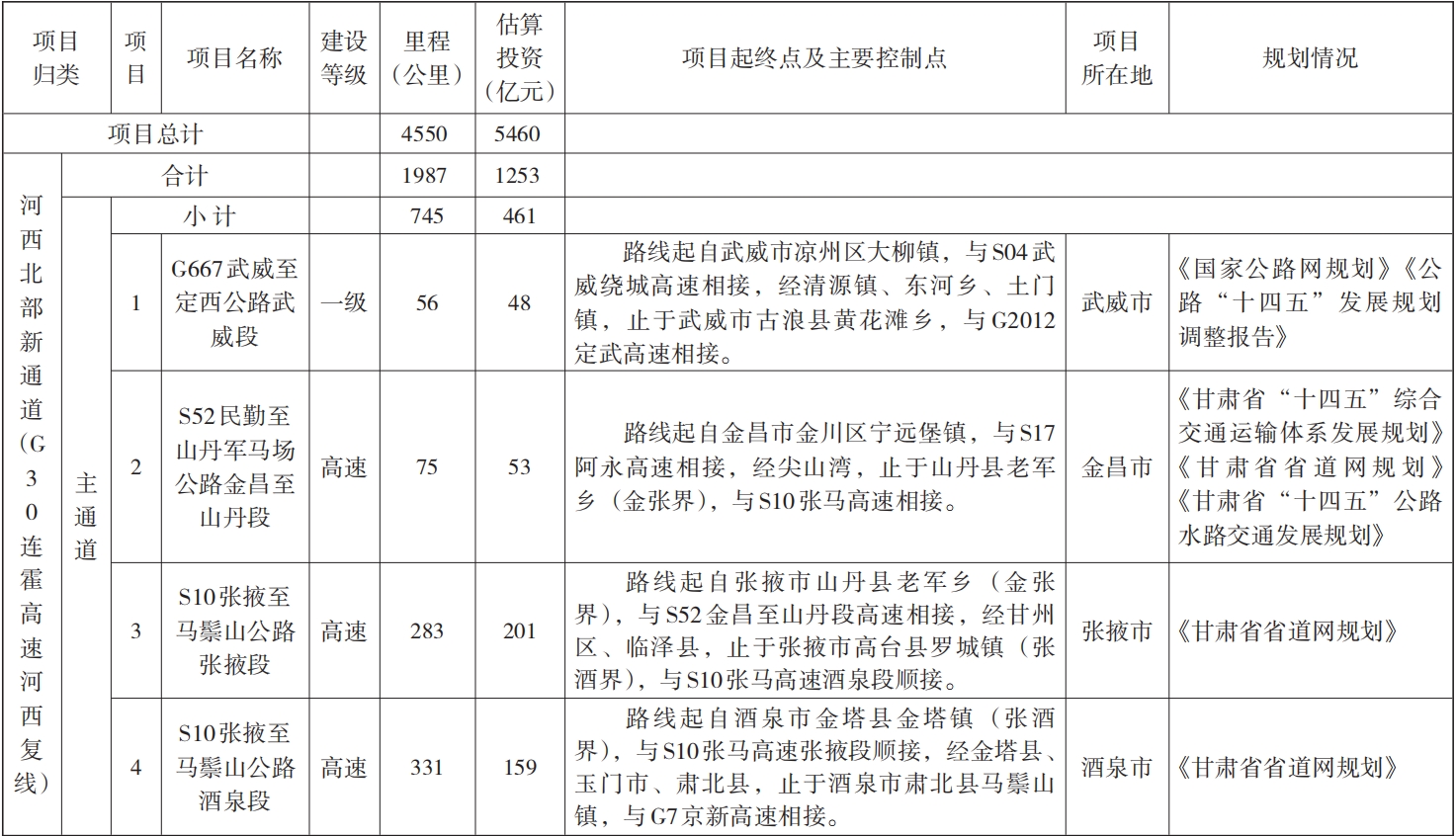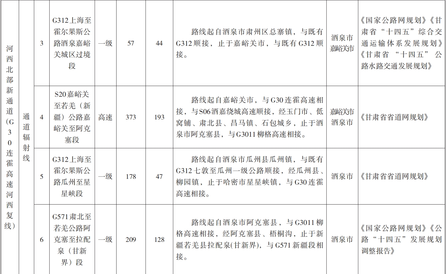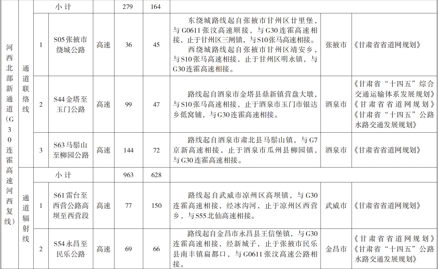 (一)河西北部高速公路新通道(G30连霍高速河西复线)。该通道起于武威市古浪县黄花滩、与G2012定武高速相接,止于酒泉市肃北县马鬃山、与G7京新高速相接,自东向西贯穿河西走廊北部,辐射武威、金昌、张掖、酒泉、嘉峪关5市和古浪、凉州、金川、永昌、山丹、民乐、甘州、临泽、高台、金塔、肃州、玉门、肃北、阿克塞14县(市、区)。该通道由1条主通道、3条通道联络线和6条通道辐射线构成。主通道全长约854公里(利用既有109公里、新建745公里),由新建G667武威段一级公路,接既有S04武威绕城高速公路、G3017金武高速公路、S17金永高速公路,新建S52金昌至山丹高速公路和S10张掖至马鬃山高速公路,共同形成主通道。带动建设S05张掖绕城、S44金塔至玉门、S63马鬃山至柳园等联络线和S61高坝至西营、S54永昌至民乐、S20嘉峪关至阿克塞、G571阿克塞至拉配泉等新建公路,以及G312酒嘉城区过境、G312瓜州至星星峡改扩建公路等辐射线。