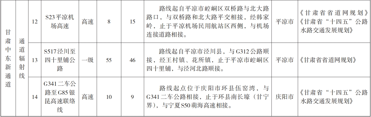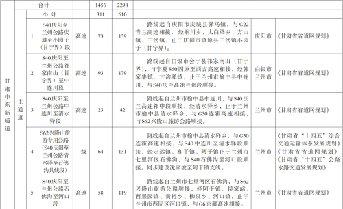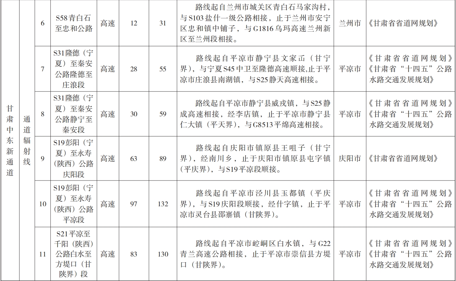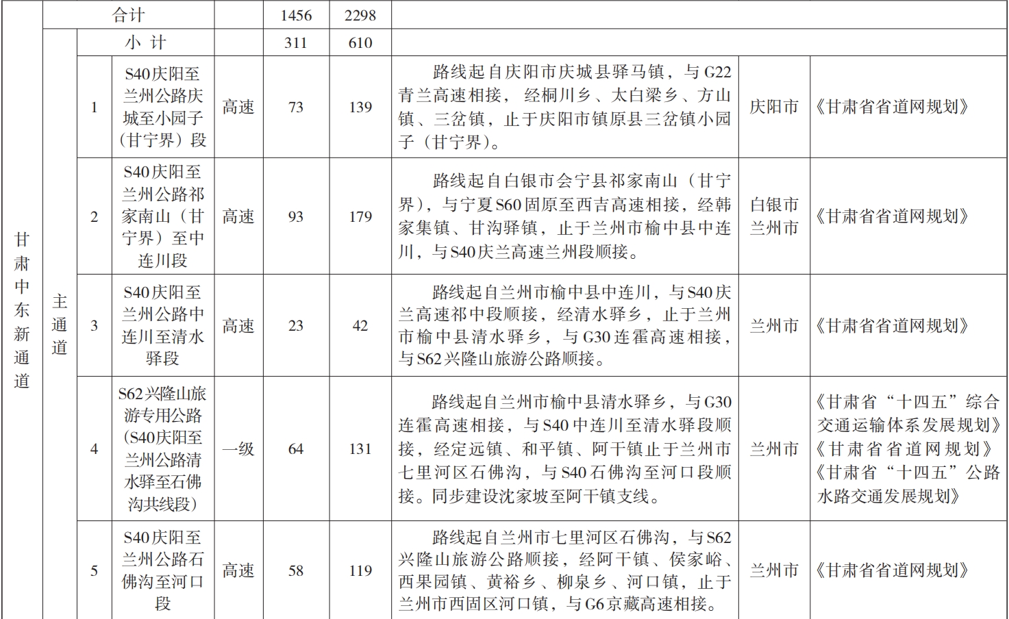 (三)甘肃中东高速公路新通道。该通道起于庆城县驿马镇、与G22青兰高速相接,止于西固区河口镇、与G6京藏高速相接,自东向西贯穿庆阳、固原(宁夏回族自治区)、白银、兰州4市,辐射庆城、镇原、崆峒、泾川、灵台、庄浪、静宁、秦安、会宁、安定、靖远、榆中、城关、七里河、西固、安宁、红古、永登、永靖、天祝20县(区)。该通道由1条主通道、5条通道联络线和14条通道辐射线构成。主通道全长311公里,由新建S40庆城至小园子(甘宁界)、S40祁家南山(甘宁界)至清水驿、S62兴隆山旅游专用公路、S40石佛沟至河口段共同形成主通道。带动建设G341中川至河桥、S01河桥至海石湾、G666景泰至兰州、G30连霍高速景家口至清水驿段扩容改造、G327宁县至镇原、S15镇原至平凉等联络线和G6京藏高速尹家庄至河口段扩容改造、G30连霍高速忠和至茅茨段扩容改造、G3032永登至天堂寺、S01兰州经济圈环线北湾至定西、S01兰州经济圈环线永靖至花庄、S58青白石至忠和、S31隆德至庄浪、S31静宁至秦安、S19彭阳(宁夏)至永寿(陕西)平凉段、S19彭阳(宁夏)至永寿(陕西)庆阳段、S21平凉至千阳(陕西)、S23平凉机场高速、S517泾川至四十里铺、G341二车公路至G85银昆高速等辐射线。