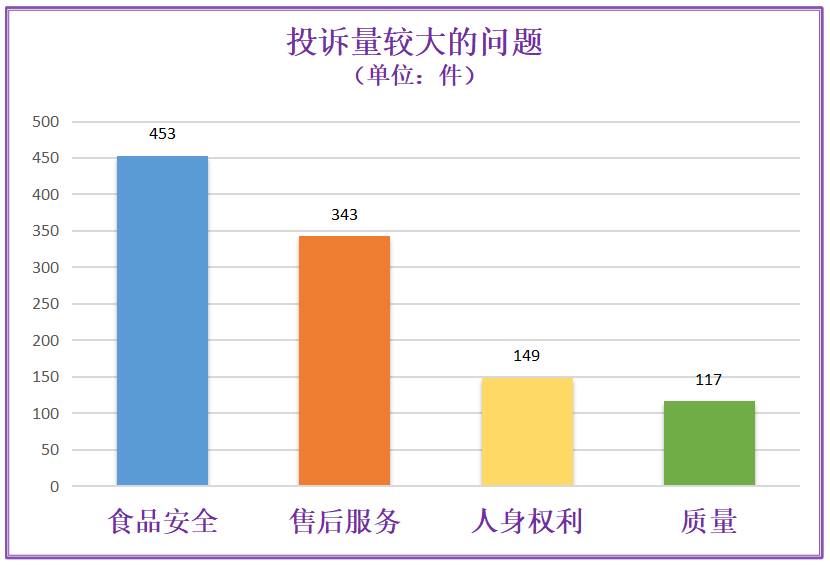 从投诉问题来看,投诉受理量较大的主要有:食品安全(453件)、售后服务(343件)、人身权利(149件)、质量(117件)。