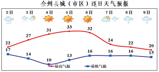【天气预报】未来一周有两次降水降温天气过程,4日、5日、6日全州大部将有晴热高温天气,最高气温将达30℃以上。具体预报:2日10:00~3日07:00全州阴有分散性阵雨,降水量5.0~15.0毫米;3日07:00~7日14:00全州晴或多云,其中,3日15:00~20:00全州有分散性对流天气;7日14:00~9日20:00全州阴有分散性阵雨。周内最高气温33℃左右,最低气温14℃左右。