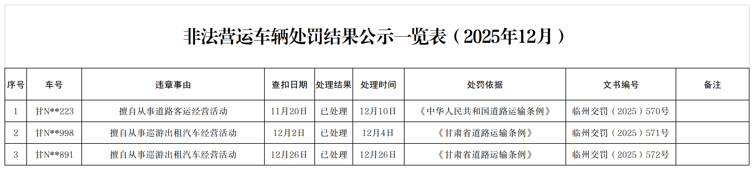 2025年非法营运车辆处罚登记台账(12月份)