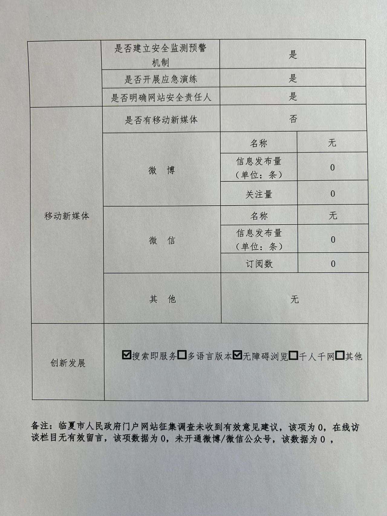 备注:本网站办事服务栏目对和政县政务服务网相关办事服务事项进行了前端整合显示,办事服务数据来源于和政县政务服务网。网站未转载媒体评论文章,相关数据为0;网站未开设在线访谈、征集调查栏目,相关数据为0。以县政府办公室名义开设微信订阅号,未开设微博及其他移动新媒体,相关数据为0。