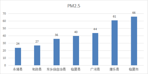 临夏县、永靖县、东乡县PM2.5达标外,其他各县市PM2.5均超过国家年二级标准(35微克/立方米)。
