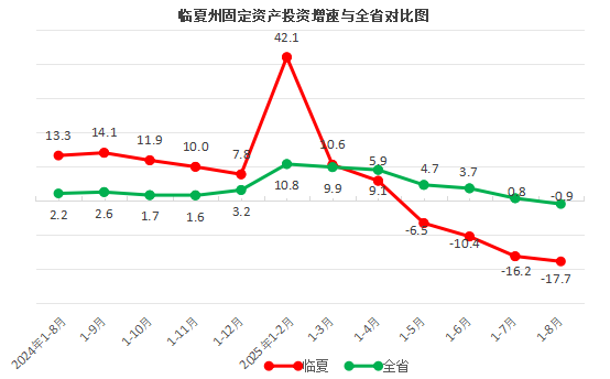 1-8月份,临夏州固定资产投资增速持续运行在低位区间,降幅比上月收窄4.3个百分点。