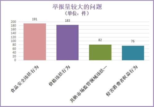从举报问题来看,举报量较大的主要有:食品安全违法行为(387件)、价格违法行为(159件)、侵害消费者权益行为(133件)、广告违法行为(88件)。