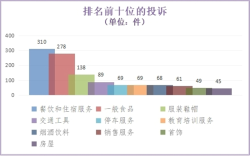投诉量排名前十位的是:餐饮和住宿服务、一般食品、服装鞋帽、交通工具、停车服务、教育培训服务、烟酒饮料、销售服务、首饰、房屋。