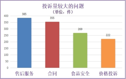 从投诉问题来看,投诉受理量较大的主要有:售后服务、合同、食品安全、价格投诉。