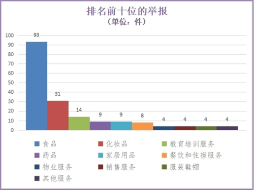 举报量排名前十位的是:食品、化妆品、教育培训服务、药品、家居用品、餐饮和住宿服务、物业服务、销售服务、服装鞋帽、其他服务。
