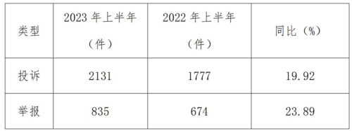 2023年上半年,12315共接收举报835件,其中商品类举报413件,占举报总量的49%;服务类举报422件,占举报总量的51%。