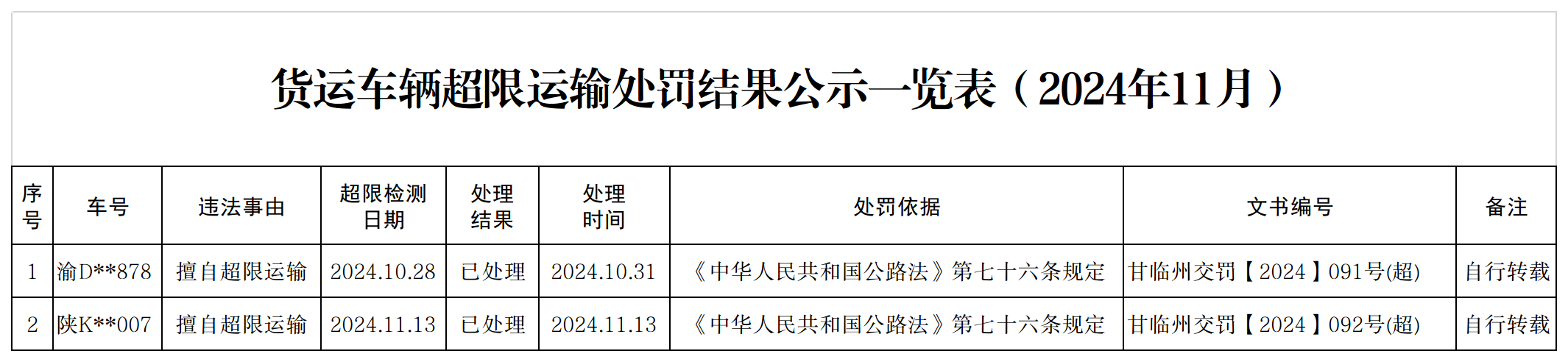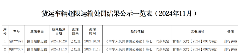 2024年11月份货运车辆超限运输处罚结果公示一览表
