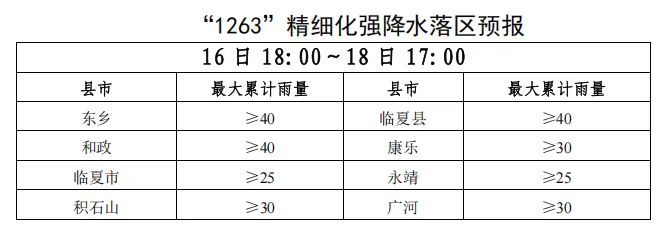 县市降水量:临夏市13.1~19.0毫米,永靖17.3~42.5毫米,东乡1.8~28.3毫米,广河1.7~8.9毫米,和政4.3~19.0毫米,康乐0.2~4.8毫米,积石山1.6~36.9毫米,临夏县2.7~23.4毫米。