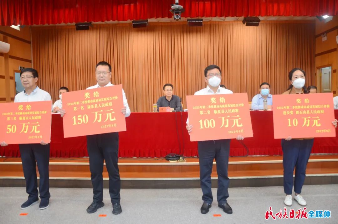 会上,传达学习中央、省上有关会议精神,通报上半年经济运行情况和推动高质量发展重点工作完成情况评价结果,对获得前三名的康乐县、临夏县、临夏市和进步奖的积石山县进行表彰,康乐县、临夏县作交流发言,永靖县、东乡县作表态发言。