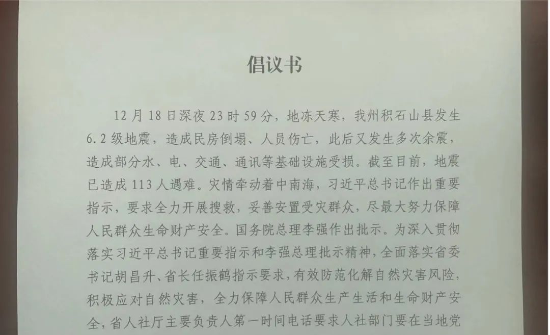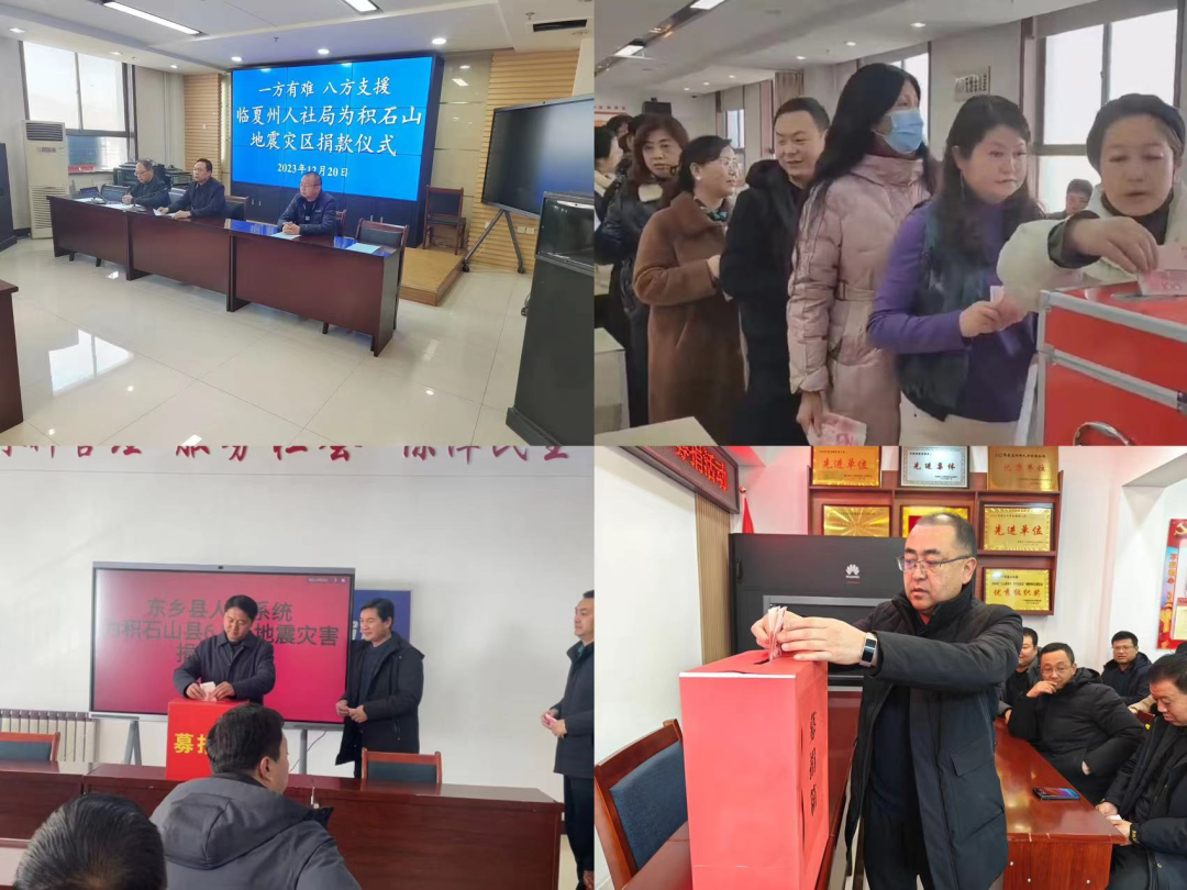 握指成拳,汇溪成江,积聚起众人拾柴的良好氛围。12月19日,地震发生次日,州人社局向干部职工迅速发出倡议书,20日上午,开展抗震救灾募捐活动,共募集资金3.2万余元,将价值相等的灾区急需煤炭物资送至大河家镇安置点。一石激起千层浪,颗颗爱心向灾区迅速汇聚,各县市人社部门也同步开展救灾募捐活动,其中东乡县人社局动员干部职工募捐2万余元,广河县人社局募捐2.4万余元,已通过红十字会购置物资送至灾区。和政县协调厦门建霖集团,向积石山县灾区捐赠现金100万元,用于紧急救援受灾群众过渡安置及受灾地区灾后重建工作,对此建霖集团前董事长表示:“我们集团有700-800名员工来自临夏州,我们和当地的感情不一样”。