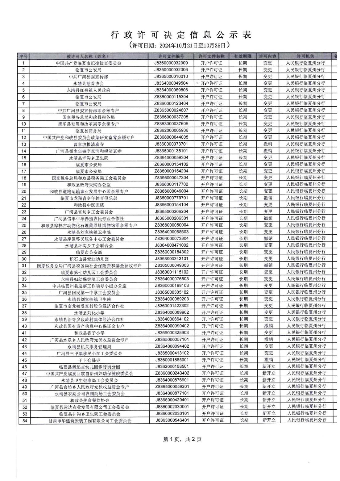 人民银行临夏州分行行政许可信息公示表(2024.10.21-2024.10.25)