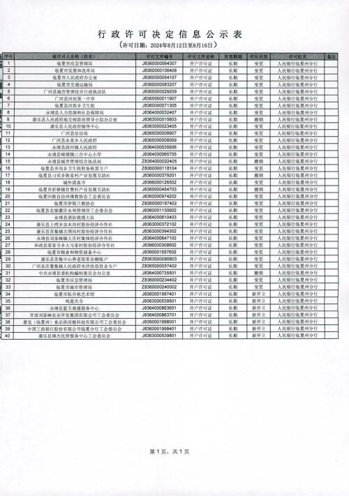 人民银行临夏州分行行政许可信息公示表(2024.8.12-2024.8.16)