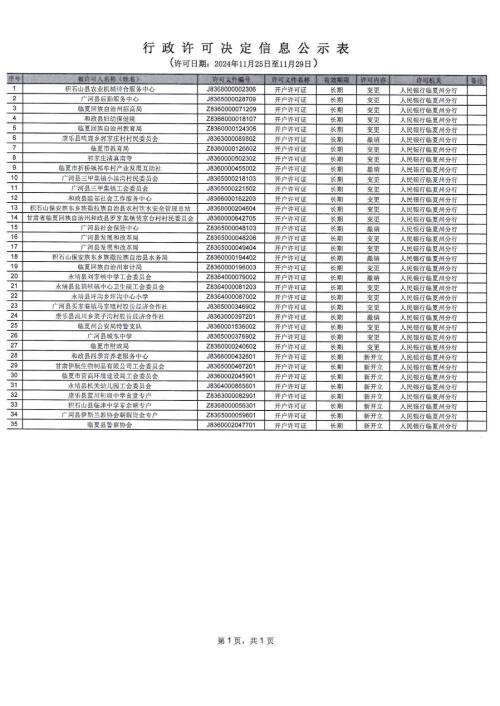 人民银行临夏州分行行政许可信息公示表(2024.11.25-2024.11.29)