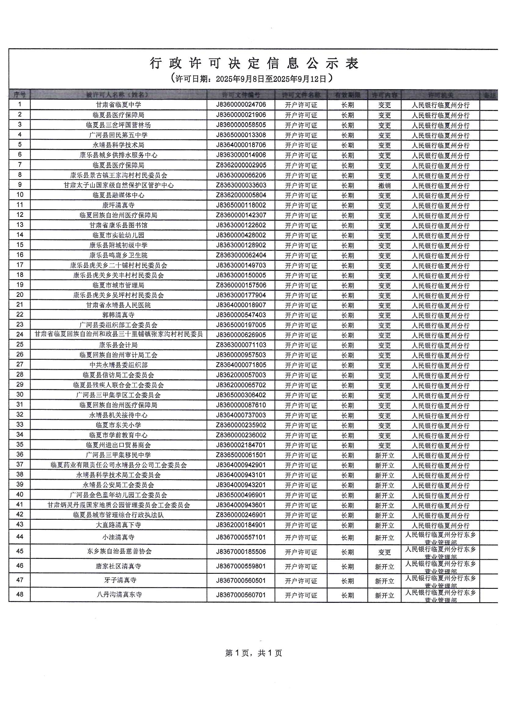 人民银行临夏州分行行政许可信息公示表(2025年9月8日-2025年9月12日)