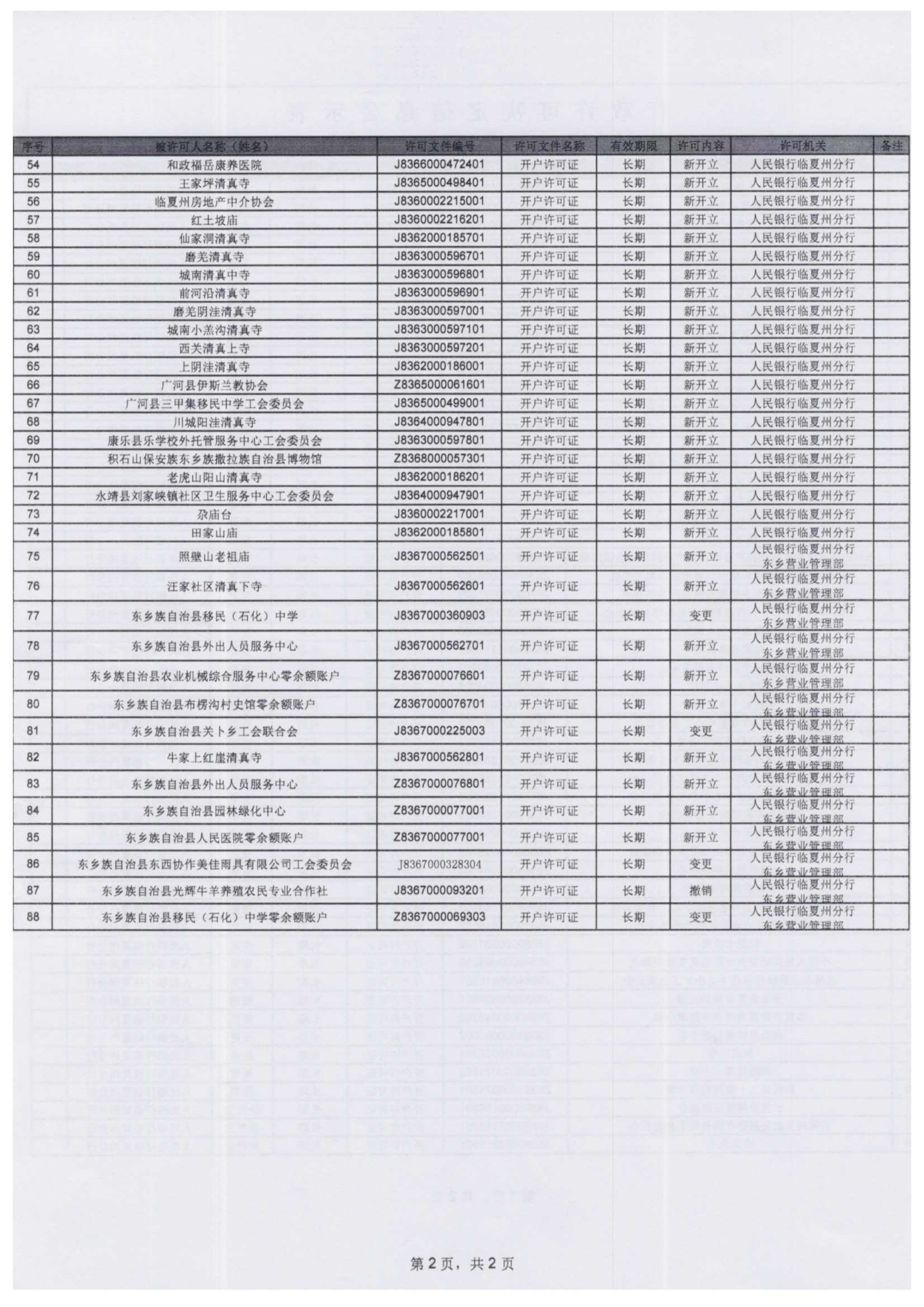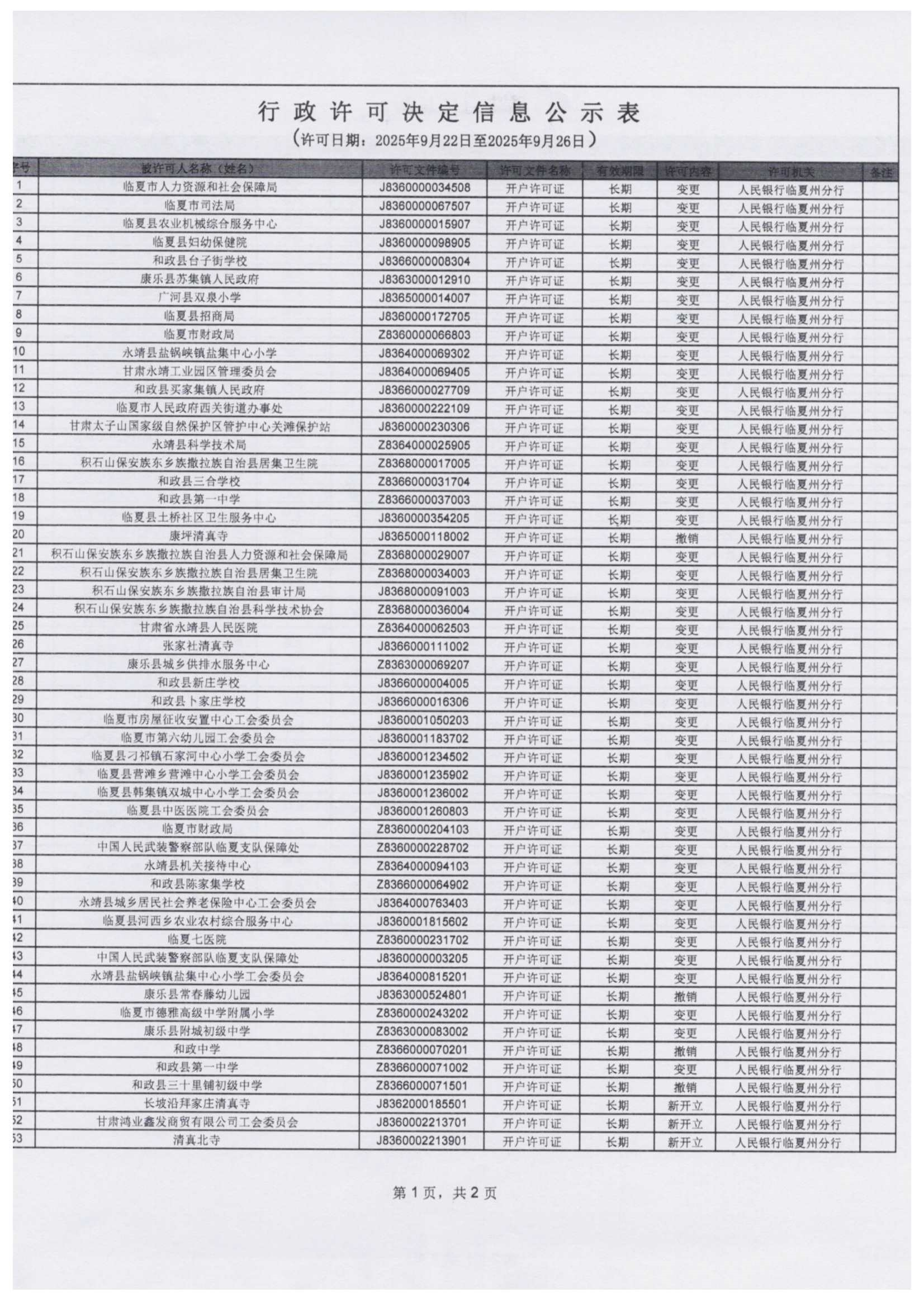 人民银行临夏州分行行政许可信息公示表(2025年9月22日-2025年9月26日)