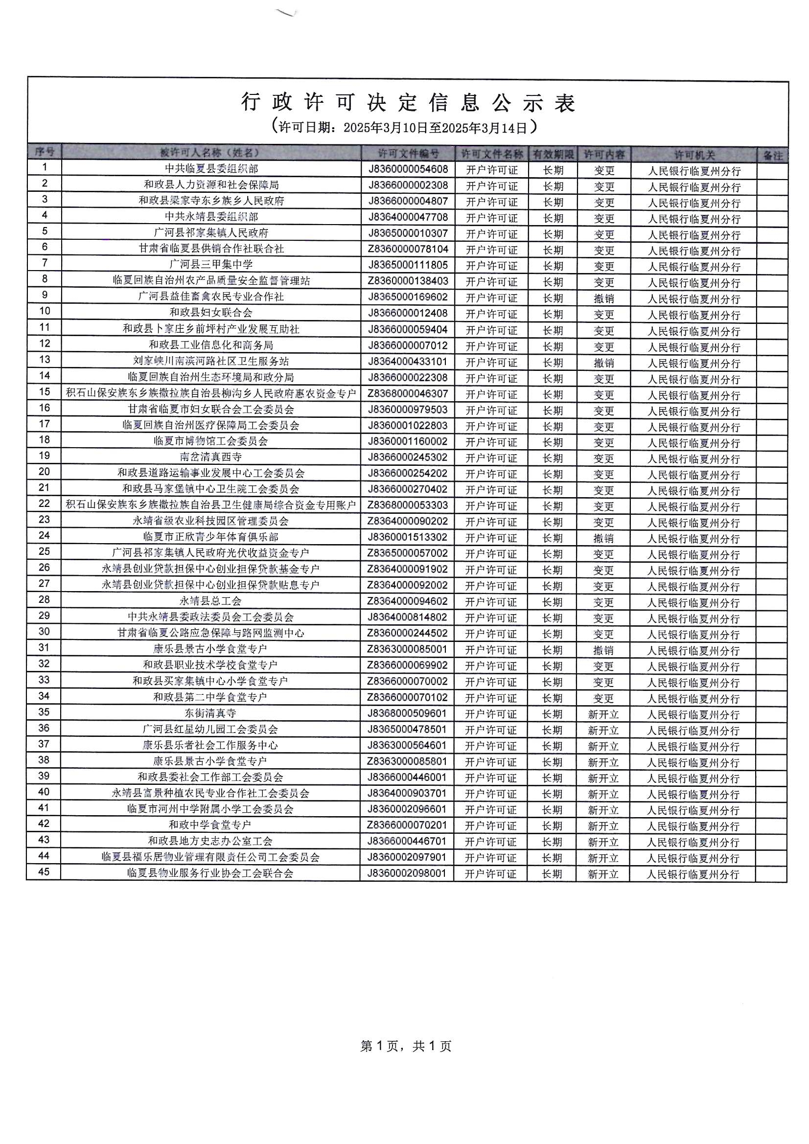 人民银行临夏州分行行政许可信息公示表(2025年3月10日-2025年3月14日)