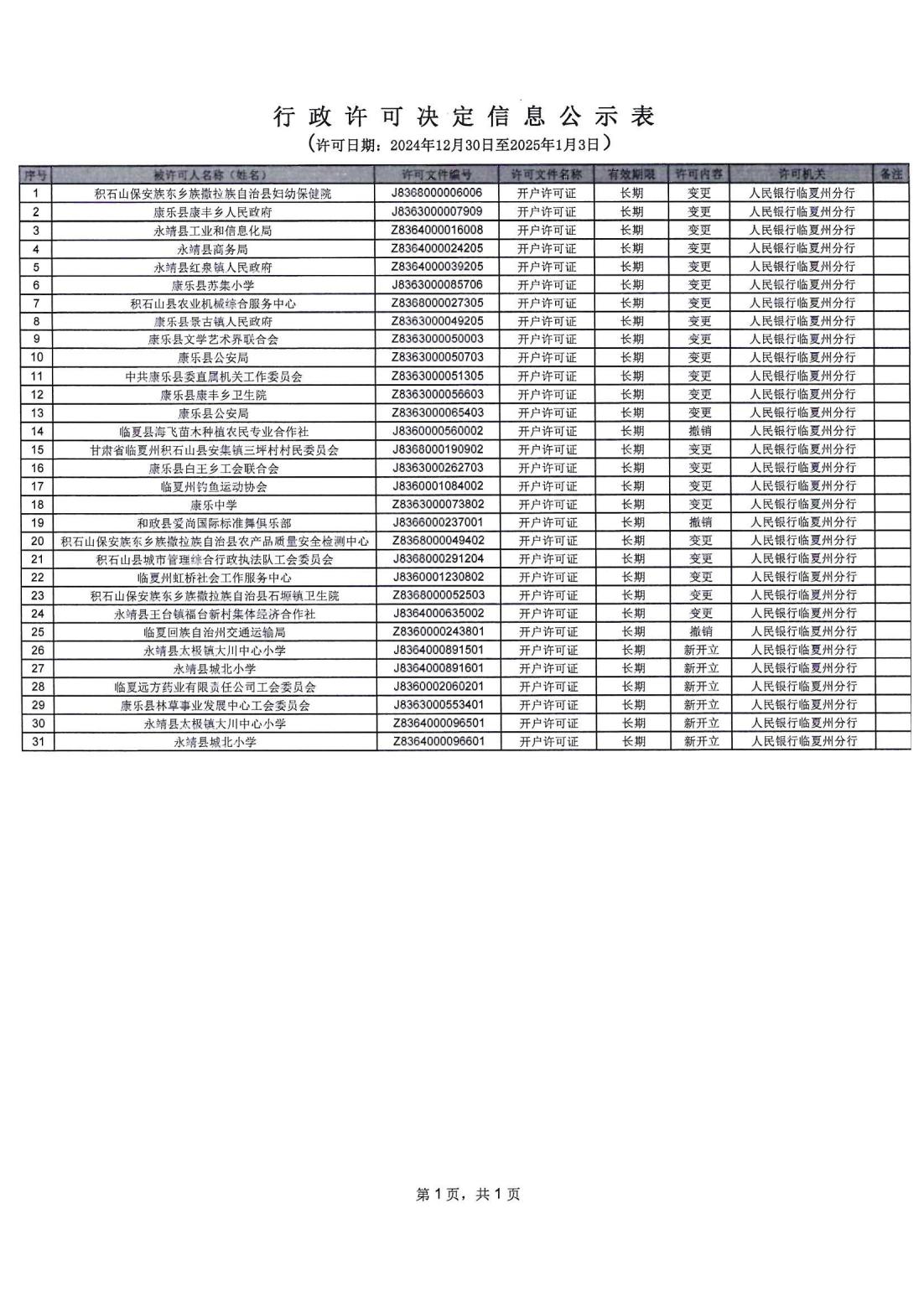 人民银行临夏州分行行政许可信息公示表(2024.12.30-2025.1.3)