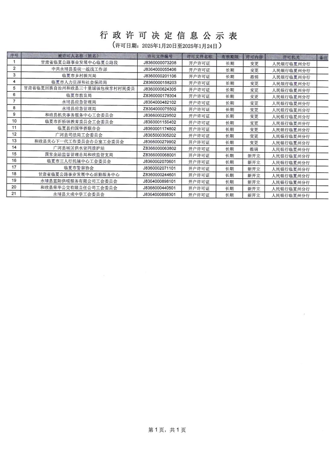 人民银行临夏州分行行政许可信息公示表(2025.1.20-2025.1.24)