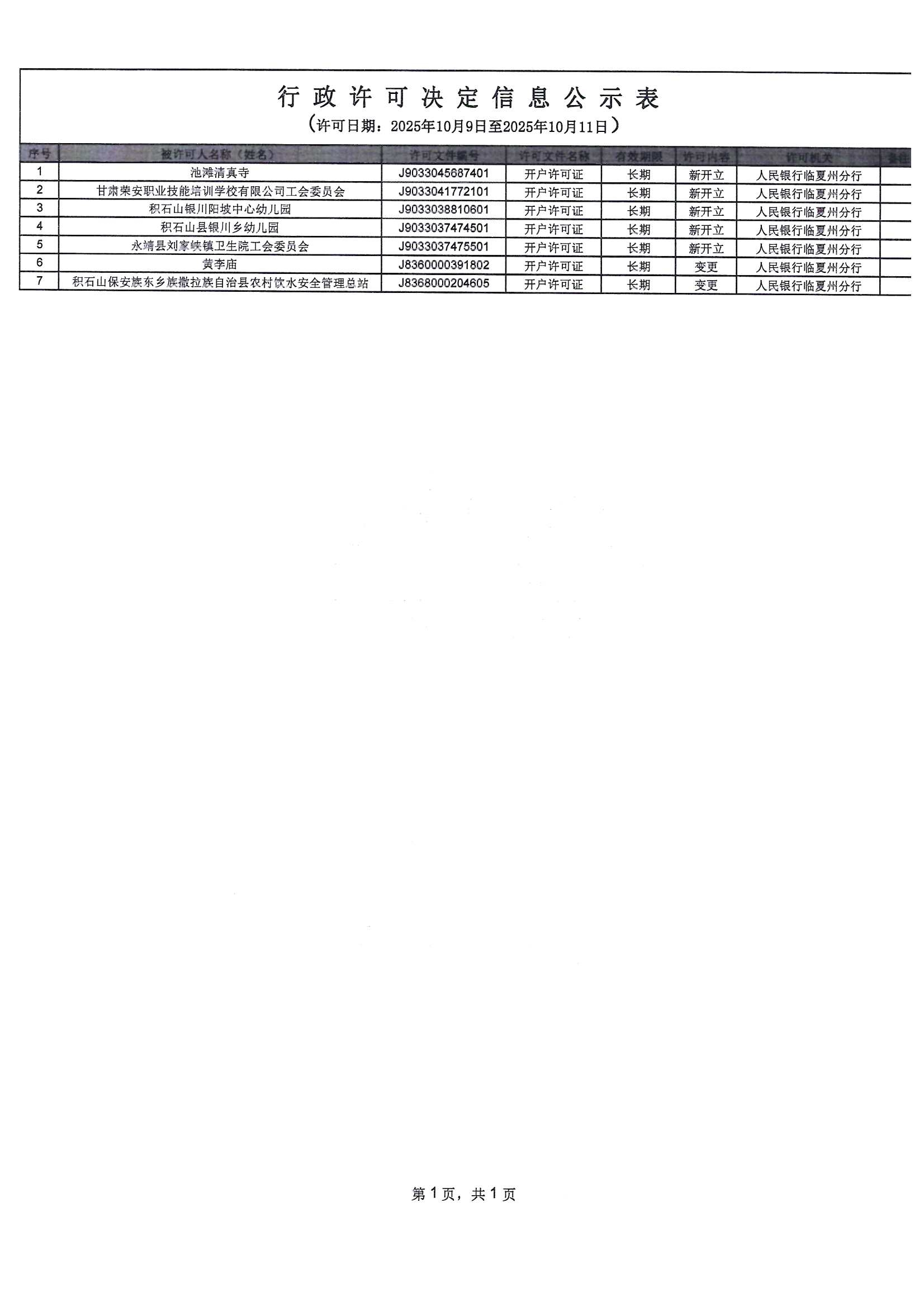 人民银行临夏州分行行政许可信息公示表(2025年10月9日-2025年10月11日)