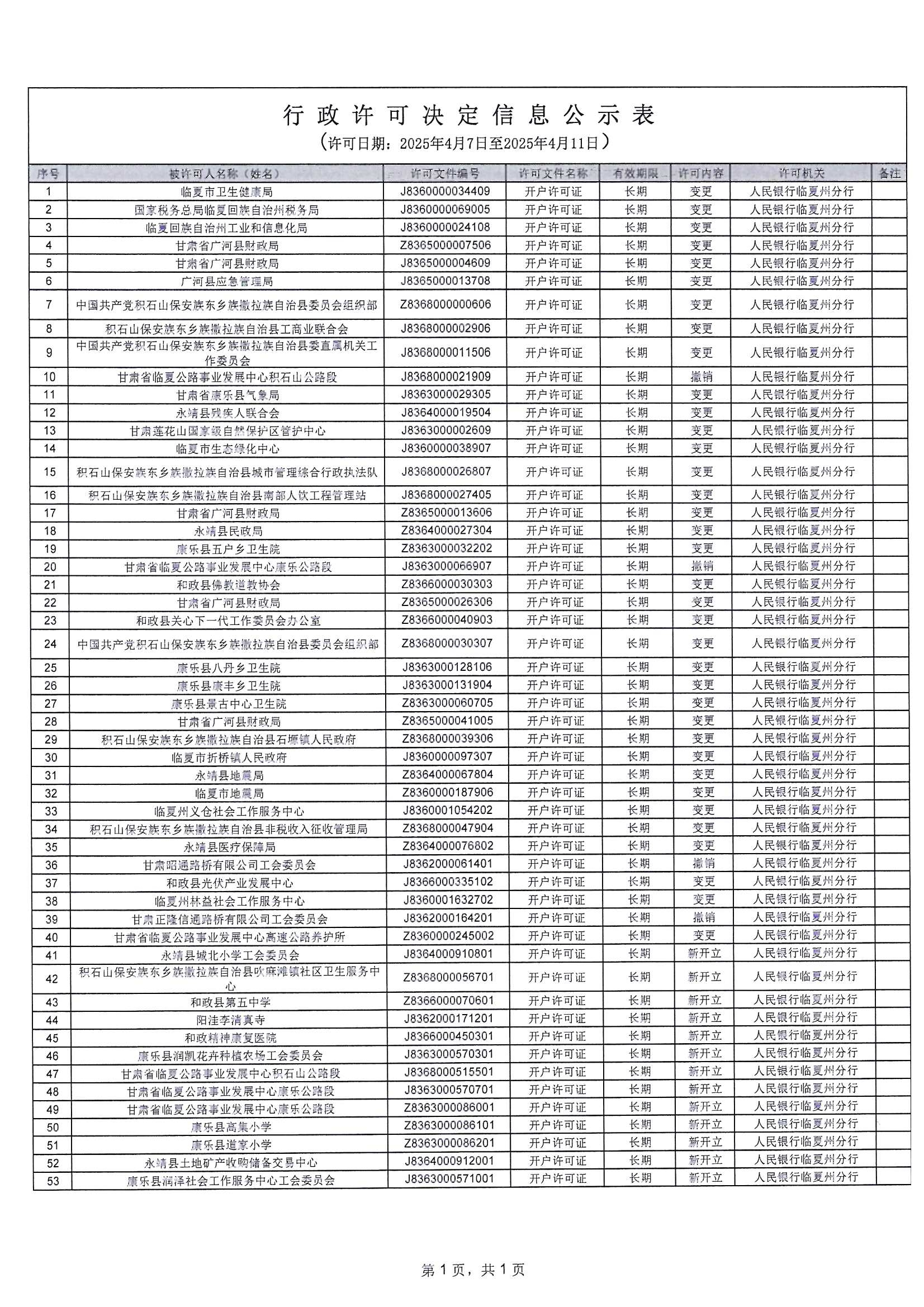 人民银行临夏州分行行政许可信息公示表(2025年4月7日-2025年4月11日)