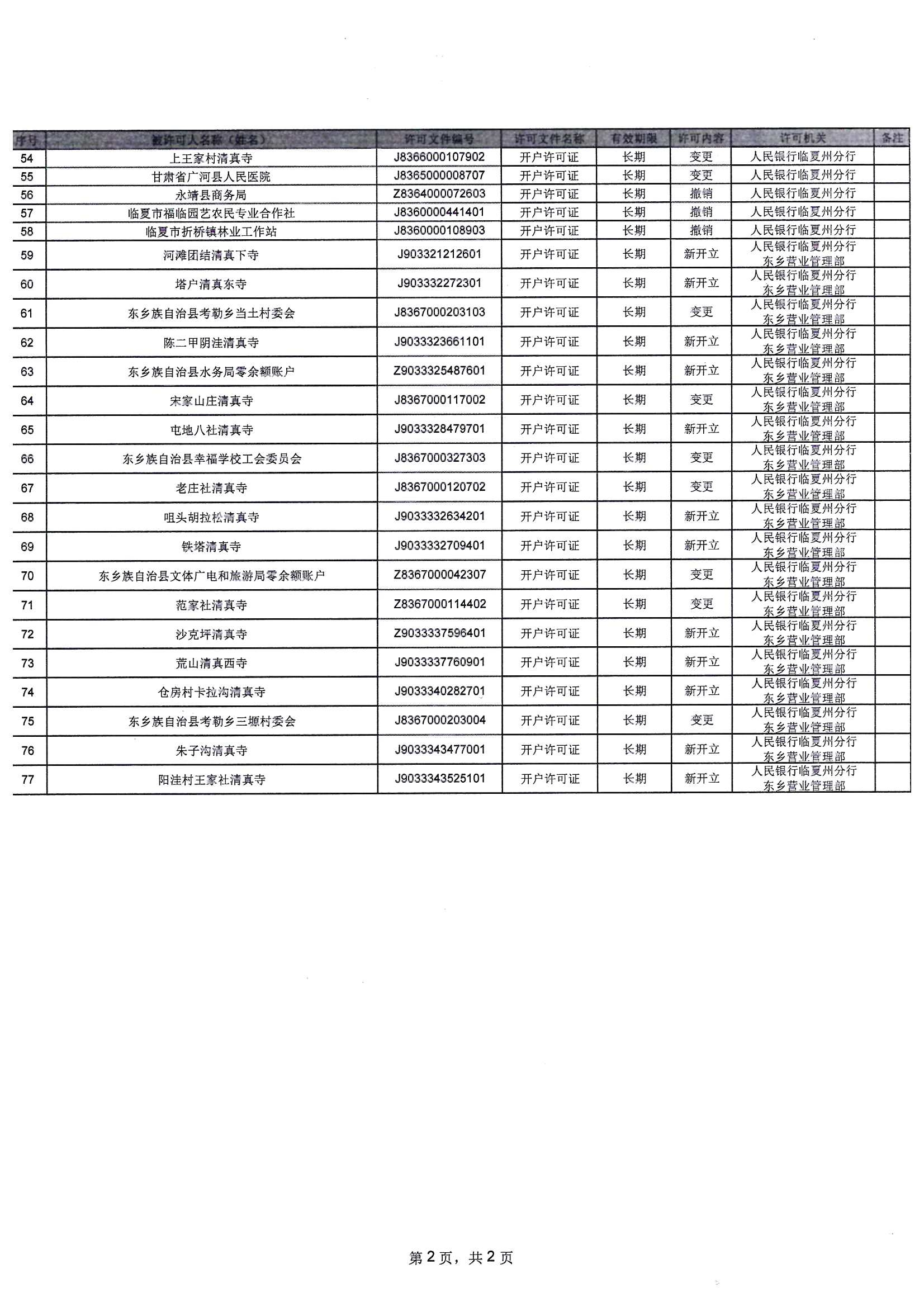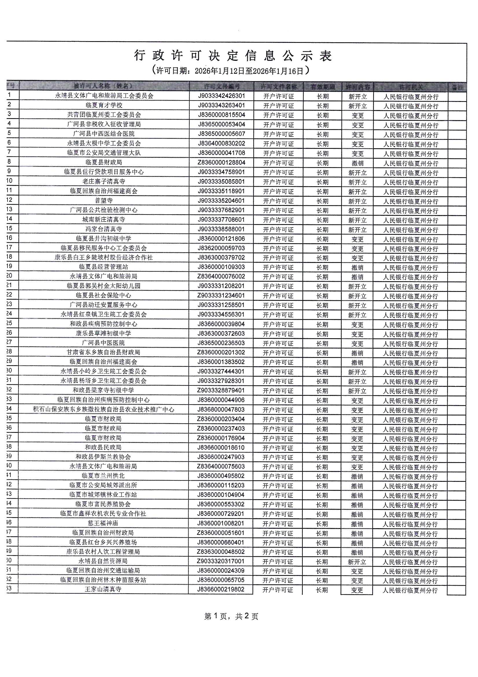 人民银行临夏州分行行政许可信息公示表(2026年1月12日-2026年1月16日)