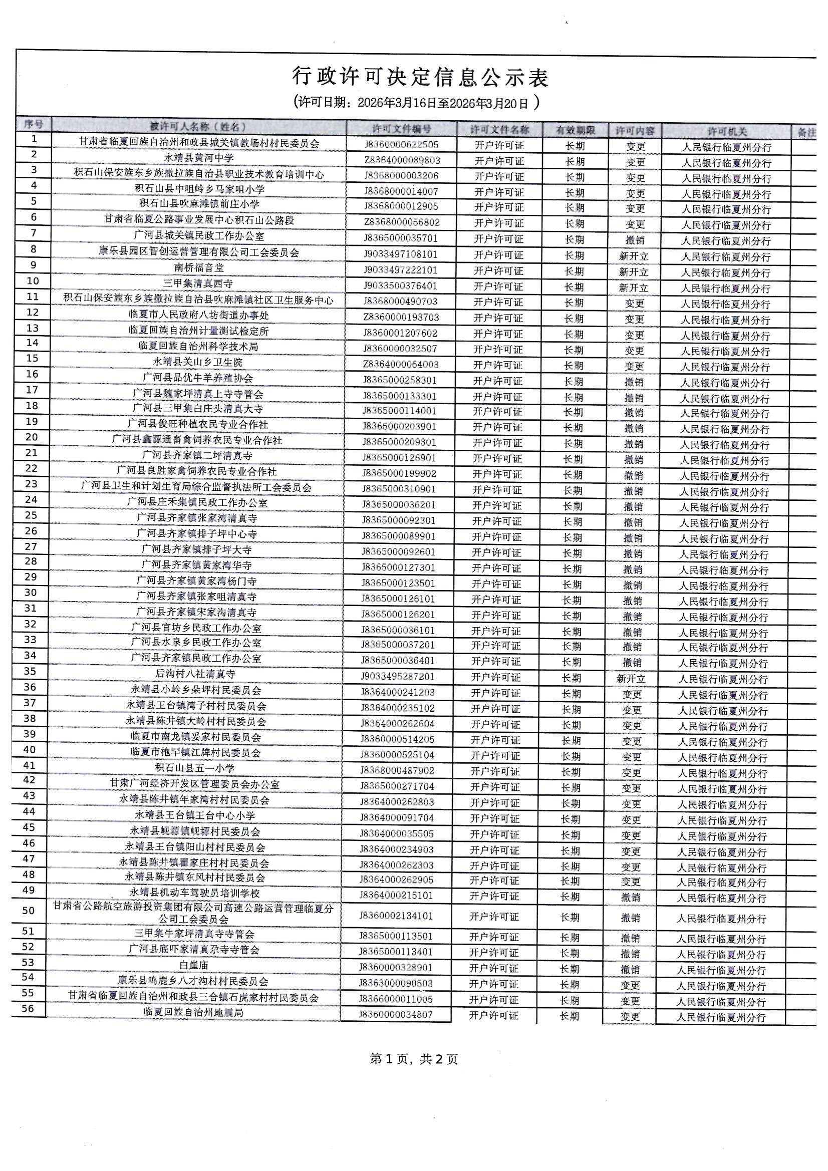 人民银行临夏州分行行政许可信息公示表(2026年3月16日-2026年3月20日)