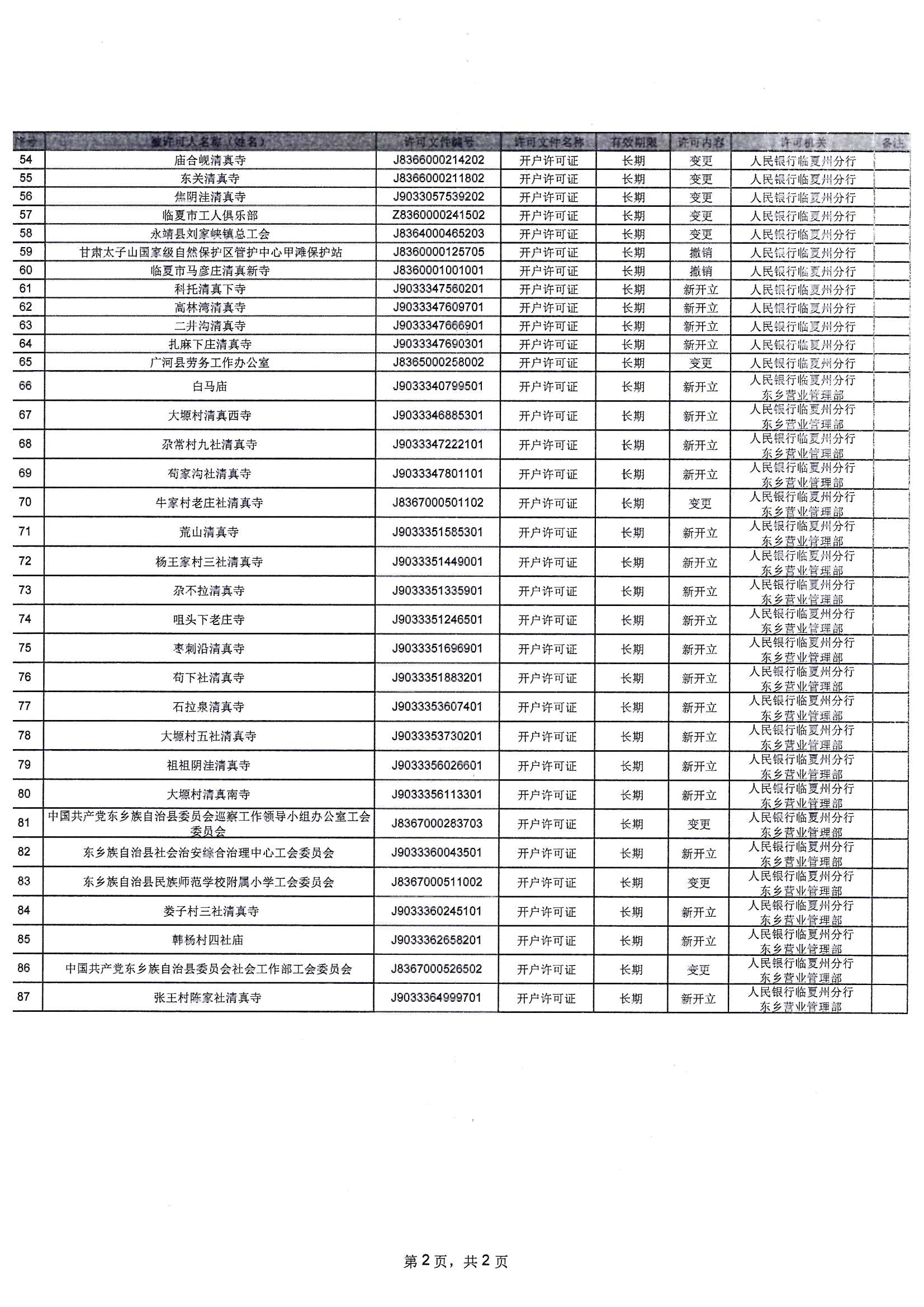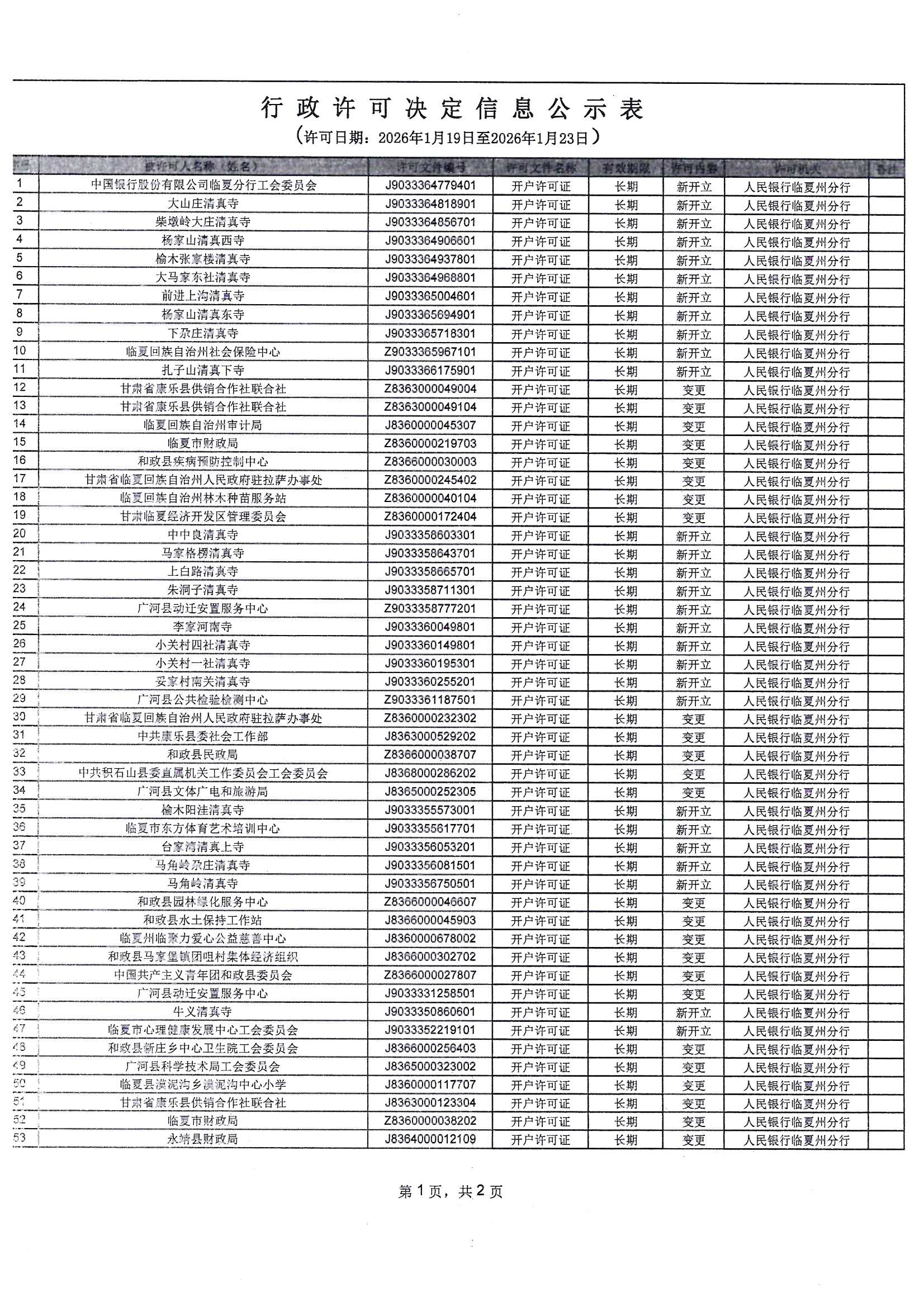 人民银行临夏州分行行政许可信息公示表(2026年1月19日-2026年1月23日)