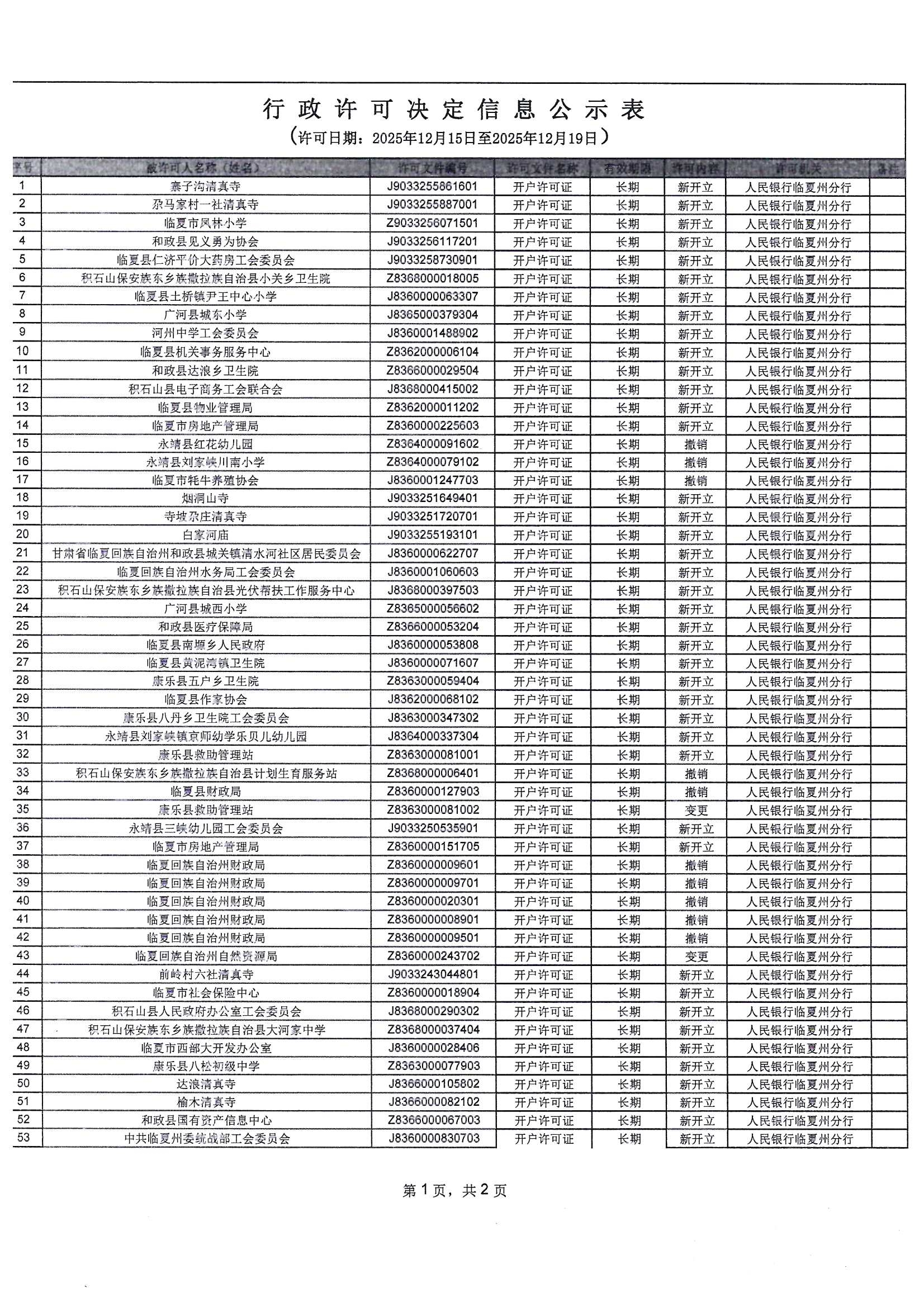 人民银行临夏州分行行政许可信息公示表(2025年12月15日-2025年12月19日)