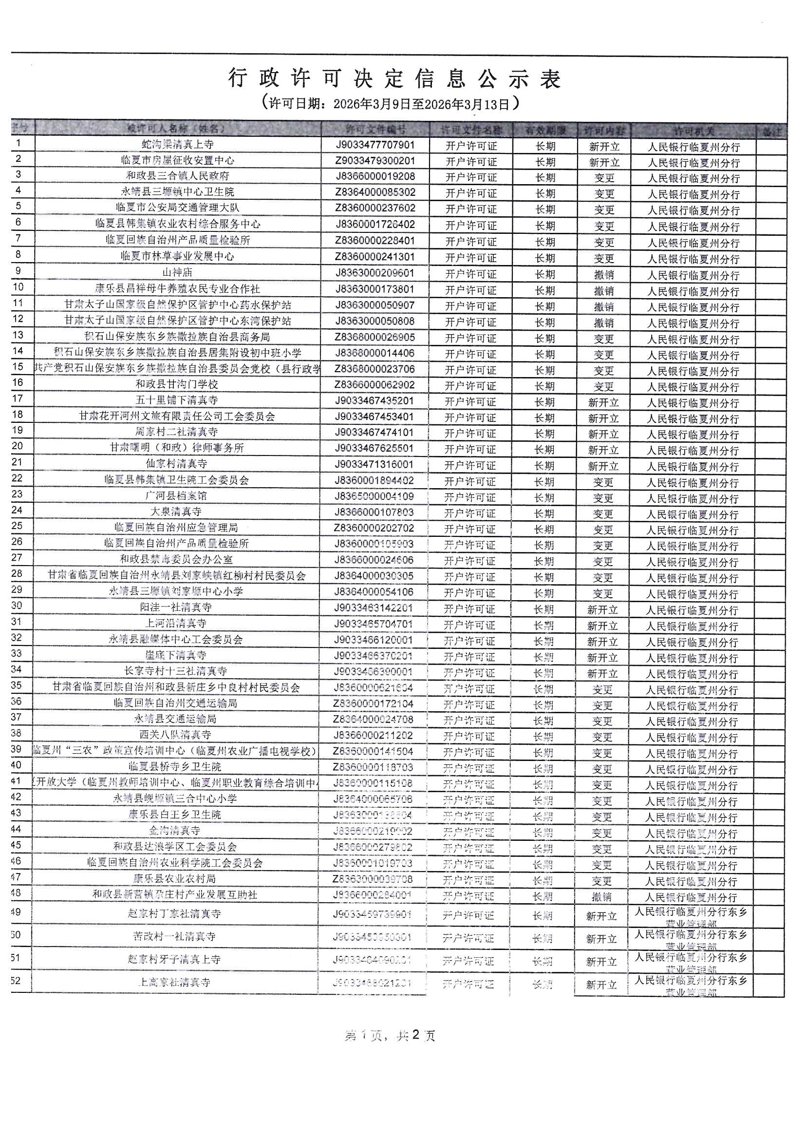 人民银行临夏州分行行政许可信息公示表(2026年3月9日-2026年3月13日)
